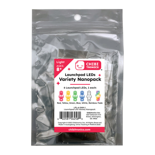 Launchpad reusable LEDs have large, sturdy pads that are clearly identified as positive and negative. This makes it easier for learners to make (and remake) circuits to light up a project. The Launchpad LEDs Variety Nanopack contains 6 LEDs (each a different color).